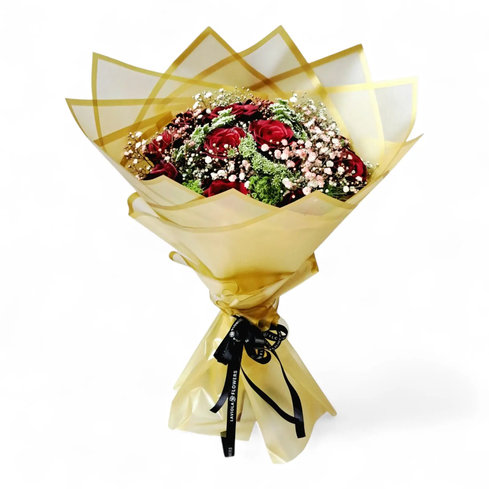 Elegant Red – With Gypsophila features 10 premium red roses, beautifully arranged with delicate white gypsophila and wrapped in luxurious gold paper for a refined and sophisticated presentation.